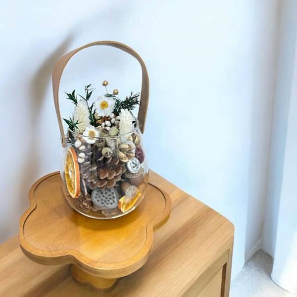 香氛擴香瓶 選擇一個玻璃容器,黏上皮革帶當作提把,提升美感與移動便利性。 |